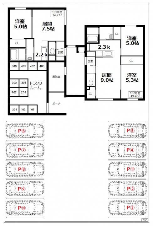 【設備】シャンドレ,TVモニター付きオートロック,トランクルーム(全戸分),灯油FF,クローゼット,アクセントクロス,全室照明,J−com対応,ペット飼育可,灯油ボイラー(2LDKのみ),ネット無料,シューズボックス